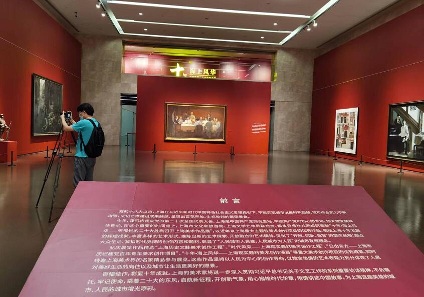“十年·海上风华——庆祝党的二十大胜利召开上海美术作品展”由上海市文化和旅游局、上海文学艺术界联合会、解放日报社共同组织策划。展览共展出作品百余件,展览精选近十年来上海组织实施的“上海历史文脉美术创作工程”“时代风采——上海现实题材美术创作工程”“日出东方——上海市庆祝建党百年青年美术创作项目”“十年·海上风华——上海现实题材美术创作项目”等重大美术创作项目的优秀成果,同时特邀上海美术界的名家精品参与展览。这些作品坚持以人民为中心的创作导向,记录时代,讴歌人民,以饱含热情的艺术表现力充分体现了上海十年壮丽发展的成就中人民对美好生活的向往以及城市让生活更美好的愿景。