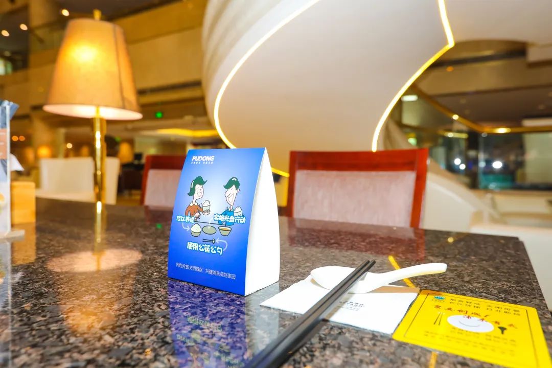 位于东方路潍坊路交界的齐鲁万怡大酒店,酒店内有公筷公勺公益广告,每张餐桌上的公筷公勺同样布置到位,提醒到位。