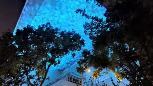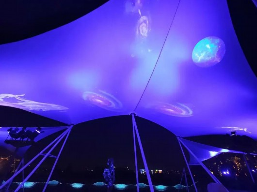 风铃广场采用投光灯进行染色,张拉膜采用静态图案灯具投影,映衬水面上的光影碧波荡漾。投光灯可围绕“星空”“海洋”主题,进行紫色、蓝色等色彩切换,并配以太空、水母等图案。