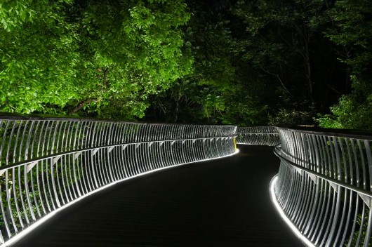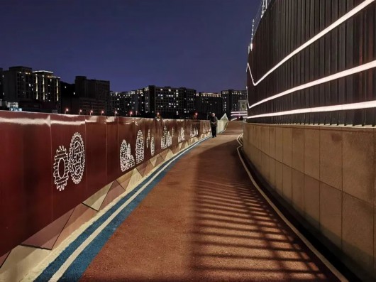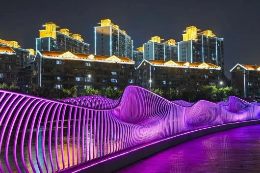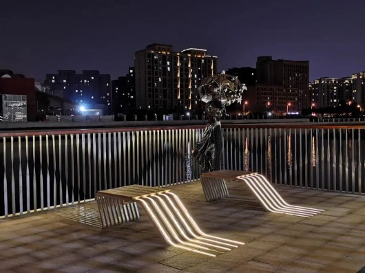 位于天原河滨公园的苏州河景观步廊,300余米的空中步廊两侧均安装了夜间照明灯光,保障行人行走安全的同时,增加艺术灯光效果。