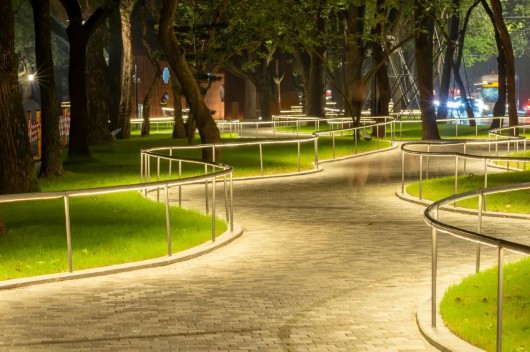 特色艺术栏杆采用动态光结合草坡的波浪投影互动,配以护坡特色漏光灯饰,气氛惬意怡人。