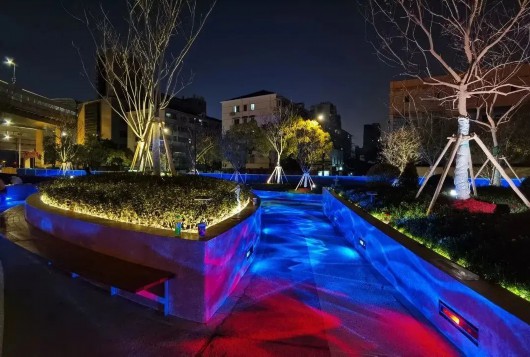 海烟物流段的夜景灯光,包括庭院灯、扶手灯、互动灯光秀等,既赏心悦目,也提升居民夜间休闲锻炼的安全性。