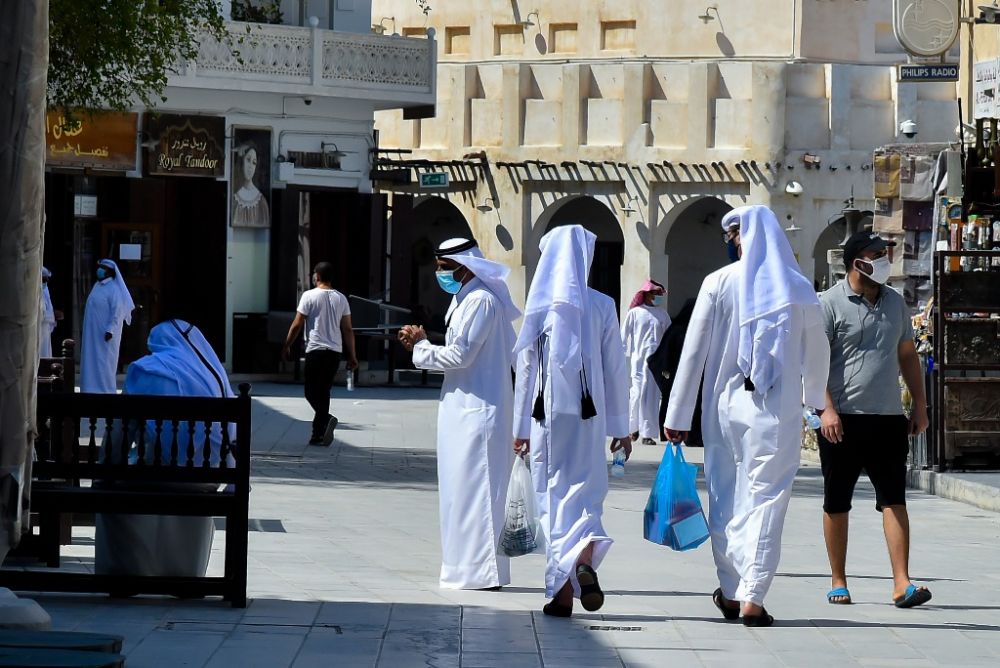 2020年7月1日,戴着口罩的顾客在卡塔尔多哈的瓦吉夫老市场购物。新华社发(尼库摄)