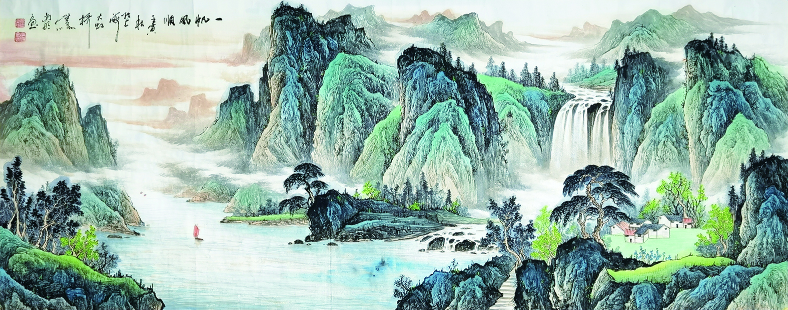 组画以山脉为主,又各有特色,或江河流淌山间,或长城盘伏山上。张尚明介绍,自己平时经常去皖浙一带写生创作,组画中有不少景观就来自皖浙地区。其中,《一帆风顺》描绘的是他在皖南新安江沿线看到的自然风光,并施以艺术加工。画面中,山峰起伏,山色青翠,山间江水平静。江上一艘小船徐徐行驶,船帆为红色,点亮了船只,又平衡了画面重心,并增添一抹悠然意境。画面右侧有房屋几座,黛瓦粉壁,依水而建,虽不见人,却为画面增添了人情味。