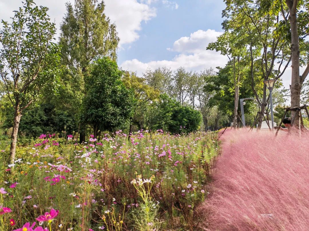 7号桥缤纷果林附近有一片粉黛乱子草,一边是蔚为壮丽的粉色海洋,一边是开得正艳的格桑花,配上秋高气爽的蓝天白云,放眼望去,仿佛走进童话世界一般。