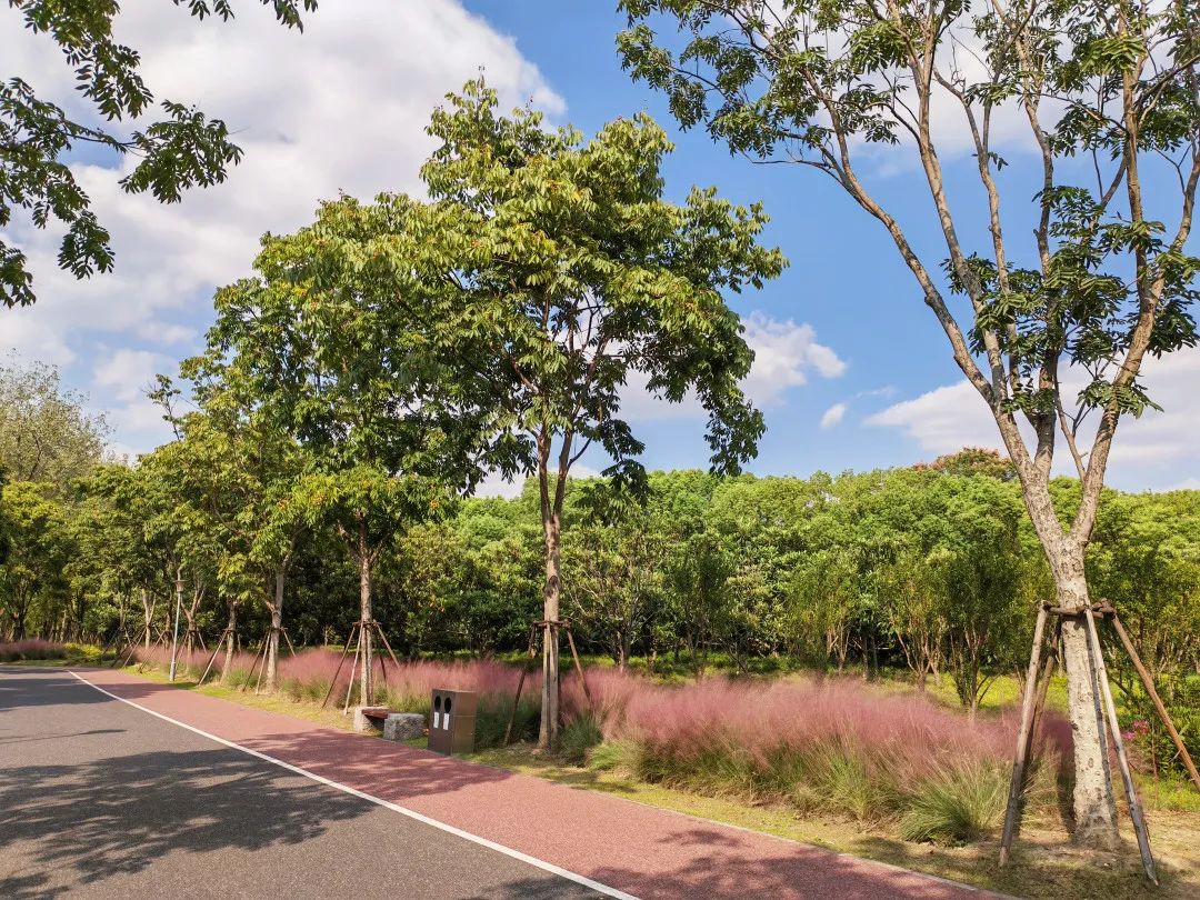 除了外环林带生态绿道,附近的虹桥体育公园正门入口处也有一片粉黛乱子草,这里人少景美,逛完了外环林带的市民不妨也去虹桥体育公园寻找野趣。