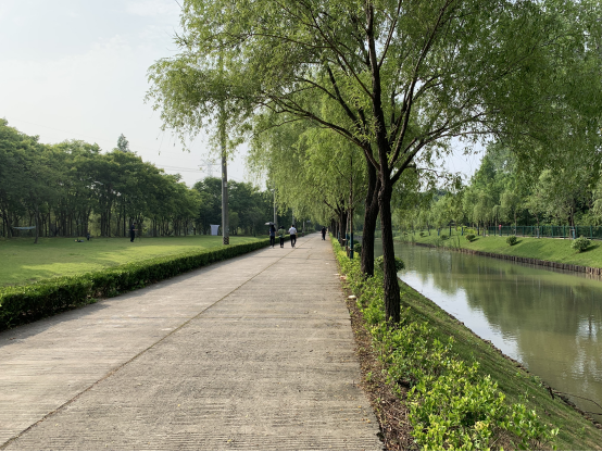 游廊总长度约1.5公里,贯通友谊河、南新河两处河道断点,形成公园主要环形“动脉”交通系统,串联各个功能节点空间,可供市民穿行不同区域,体验多种风貌变化,也能同时满足养护及应急车辆通行的需求。