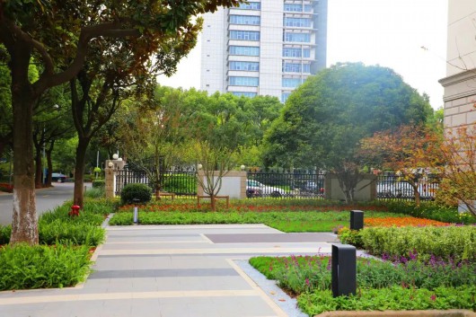 景观上注重春花秋色的季相变化,春花主打染井吉野樱;秋色突出银杏、乌桕、鸡爪槭等黄橙色暖色系主题;春末至秋季以蓝雪花、马樱丹、欧石竹花为最佳观赏,简洁雅致的规则式花境,色彩靓丽,气味芳香。