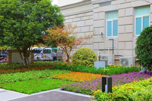 曾经的她,白墙灰顶,绿化和建筑泾渭分明;