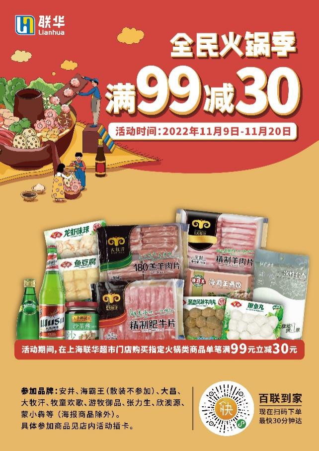 据了解,11月20日前,在上海世纪联华、联华超市直营门店,购买指定火锅类商品,即可享有满99元减30元的优惠。肉类、丸类、酱料等涮锅食材,种类丰富,应有尽有。11月9日 —— 12月4日,线上“全民火锅涮涮涮”小游戏,以有趣的抓抓乐形式,投入更多优惠神秘好礼,带给大家好玩 + 省钱的消费体验。