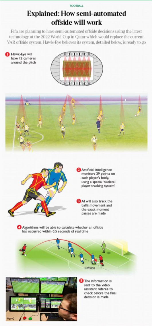 “半自动越位识别”系统将在卡塔尔世界杯得到使用,这是这项技术首次被应用在世界杯舞台。