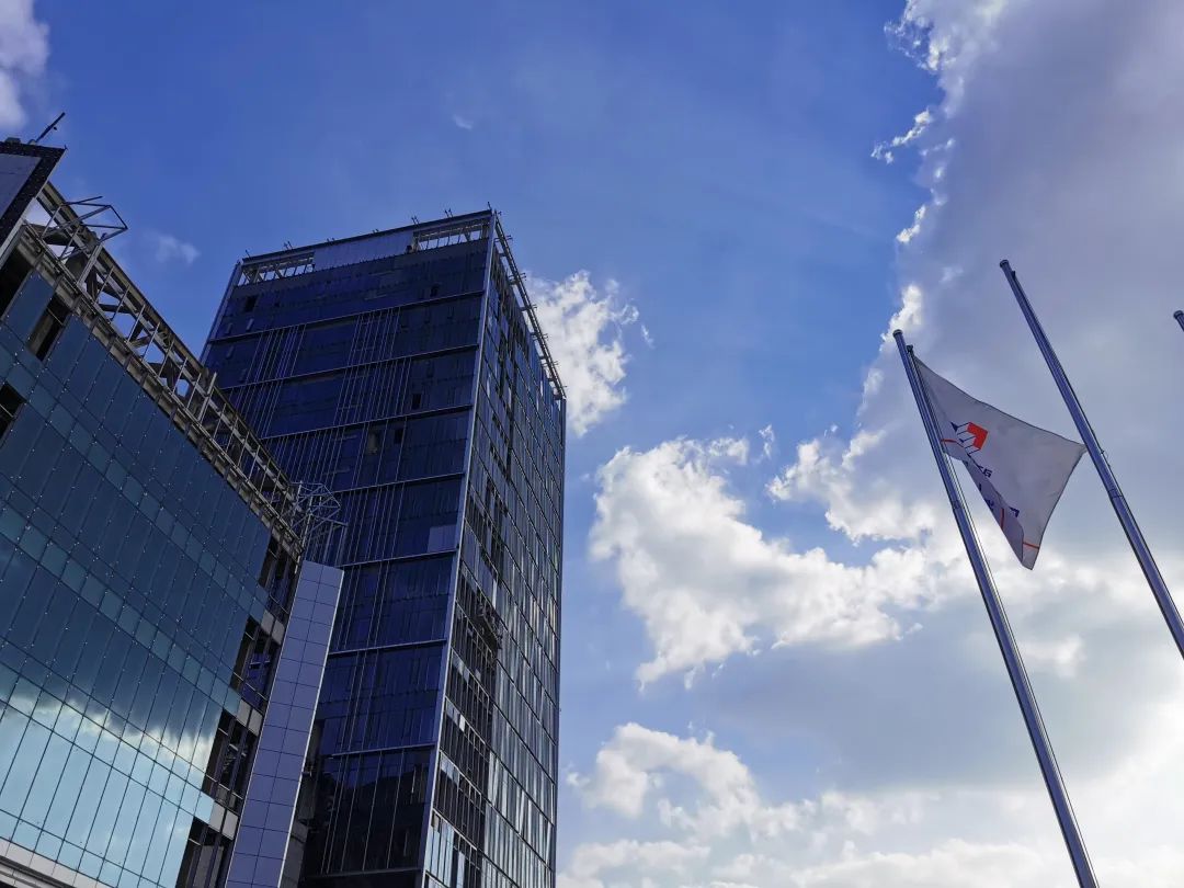 高达百米的“双子塔”位于南大路、祁连山路交会处的西南象限,深蓝色的幕墙玻璃外装熠熠生辉,与“双子塔”配套的一座综合商业副楼也在加紧实施幕墙玻璃的安装。