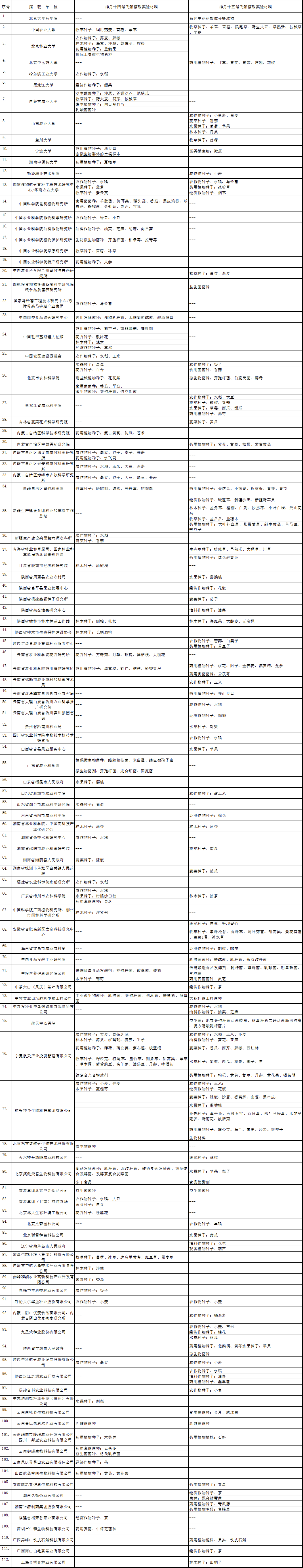 1月12日,中国载人航天工程办公室公布了神舟十四号和神舟十五号载人飞船航天育种实验项目清单。载人航天工程立项实施以来,始终注重提升综合效益,致力服务经济社会发展。在空间站建造阶段历次飞行任务中,均安排了航天育种实验项目。神舟十四号和神舟十五号载人飞船共搭载112家单位1300余份作物种子、微生物菌种等航天育种材料。