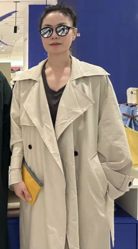 照片中,53岁的王菲扎起了头发,露出福气的大额头,精神奕奕。她戴着墨镜,身穿米色风衣,一手插兜,一手拿着黄色手包,面对镜头神情严肃,气场全开。