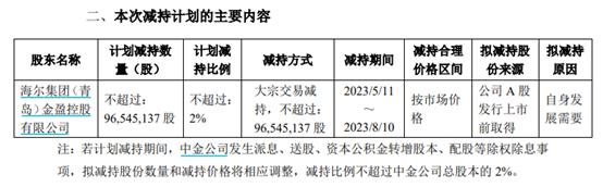 2022年6月,中金公司发布公告称,海尔金控基于自身发展需要,计划通过大宗交易方式减持不超过1.35亿股中金公司A股股份,占不超过公司总股本的2.8%,减持价格根据市场价格确定。