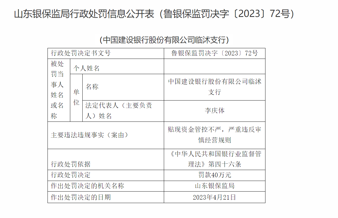 4月24日,中国银行保险监督管理委员会山东监管局官方网站公开一则行政处罚信息,中国建设银行股份有限公司临沭支行因严重违反审慎经营规则,被罚款40万元。