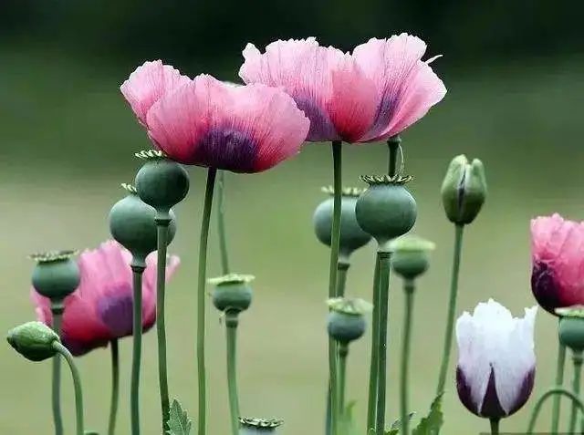 罂粟是一年生草本。叶片碧绿,花朵五彩缤纷,茎株亭亭玉立,蒴果高高在上,夏季开花,花大,单生枝顶。花瓣4片,红色、紫色或白色。果实球形或椭圆形,种子小而多。