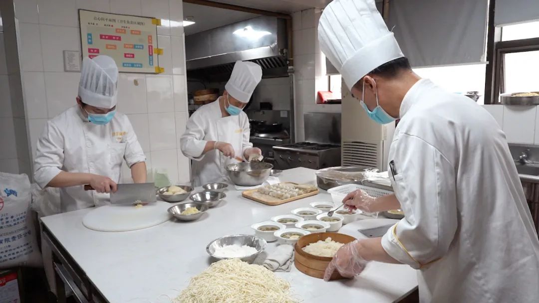 5月27日中午11点半,在嘉定迎园饭店的后厨,师傅们正热火朝天地制作冷面、冷馄饨和绿豆汤。