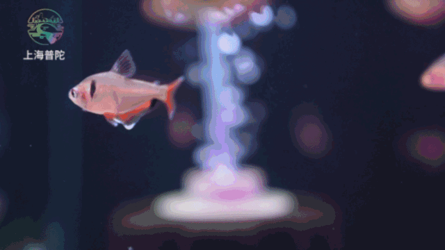 蓝色的水族箱里缤纷的鱼类将人带入海底世界,梦幻的光影极好出片。