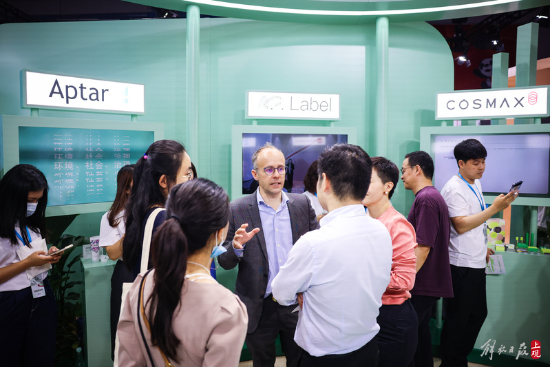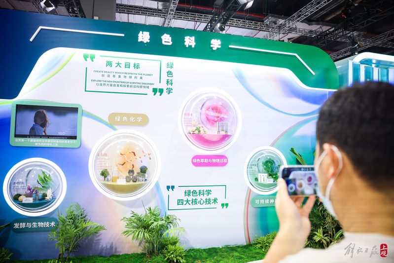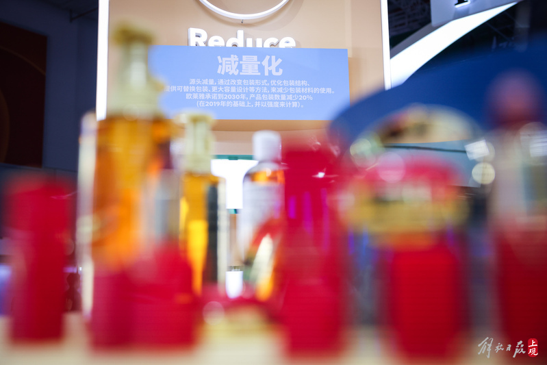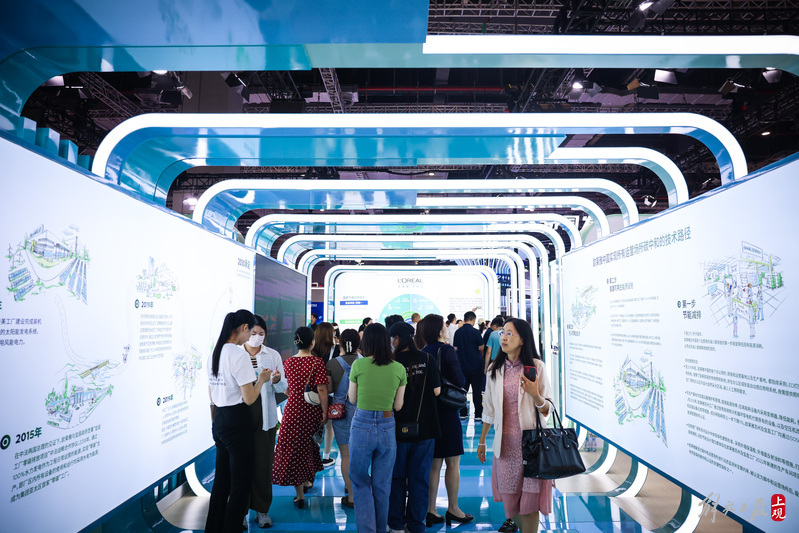 欧莱雅展台入口处醒目的艺术装置诠释了企业参展主题:一支口红的“碳索”之旅。走进展台可以直观感受口红这一消费品的减碳路径。