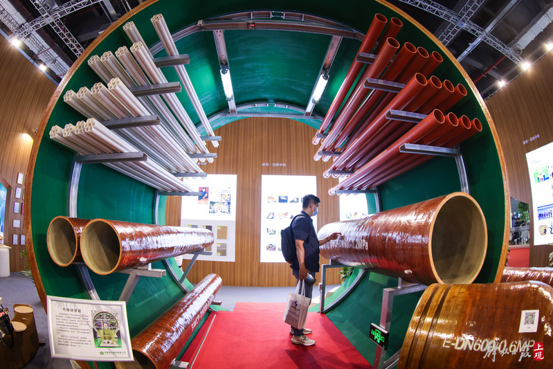 中林集团展示的竹缠绕管廊,竹缠绕复合材料是以竹子为基材、以水溶性氨基类树脂为胶粘剂,采用缠绕工艺加工成型的一种环保生态材料,质量轻、拉伸强度高、韧性好,具有资源可再生及综合利用、生产过程节能环保、产品可固碳储碳等优势。