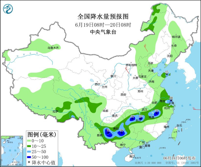 18日至20日,西南地区东部、江汉、江淮、江南、华南等地有大范围较强降雨过程,部分地区有大到暴雨,局地大暴雨,并伴有短时强降水、雷暴大风等强对流天气。其中,6月18日08时至19日08时,河南东南部、湖北大部、苏皖中部和南部、重庆东部、贵州中部和北部、湖南北部、江西北部、浙江北部、上海、广东中南部等地有大到暴雨,其中,安徽中部、江苏南部、湖北东部、湖南北部、贵州中部等地的部分地区有大暴雨(100~180毫米)(见图1)。上述部分地区伴有短时强降水(最大小时降雨量20~60毫米,局地可达70毫米),局地有雷暴大风等强对流天气。中央气象台6月18日06时继续发布暴雨黄色预警。
