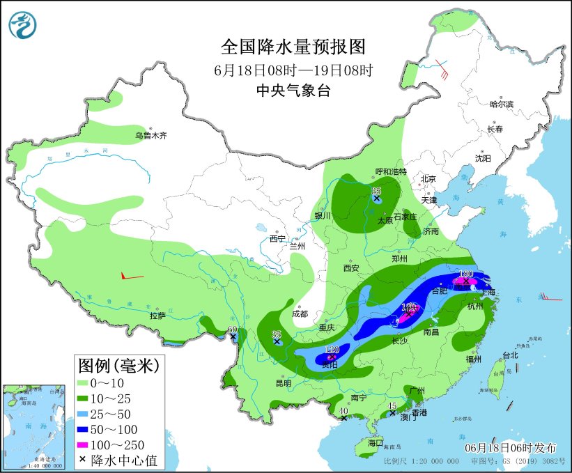 6月18日8时至19日8时,河南东南部、湖北大部、苏皖中部和南部、重庆东部、贵州中部和北部、湖南北部、江西北部、浙江北部、上海、广东中南部等地有大到暴雨,其中,安徽中部、江苏南部、湖北东部、湖南北部、贵州中部等地的部分地区有大暴雨(100~180毫米)。内蒙古东北部等地的部分地区有4~6级风,其中,西藏中部部分地区有7~8级风(见图3)。东海南部有6~7级、阵风8级风。