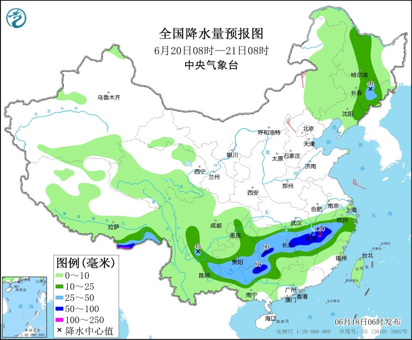 6月20日8时至21日8时,黑龙江中部、吉林中东部、江南大部、四川西南部、西南地区东南部、广西北部、西藏东南部等地的部分地区有中到大雨,其中,湖南中部和西南部、江西中北部、浙江西部、广西东北部等地部分地区有暴雨,局地大暴雨(100~120毫米)。内蒙古中部、河北北部等地的部分地区有4~5级风。东海南部有6~7级、阵风8级风。