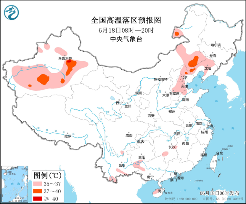 预计6月18日白天,内蒙古东南部和中部、辽宁中部和西部、新疆南疆盆地、北京中南部、天津中西部和南部、河北中南部和东北部、云南南部、广西西部、海南岛西北部等地有35~36℃高温天气,其中,内蒙古东南部、辽宁西部、新疆南疆盆地等地的部分地区最高气温37~39℃,局地可达40℃以上(见图2)。中央气象台6月18日06时继续发布高温黄色预警。