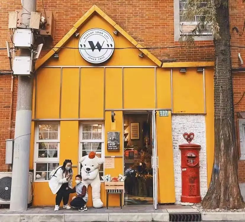 咖啡馆设在甜爱路的小别墅内,共有两层。一楼售卖鲜花,二楼可以喝咖啡。整个布置处处都透露着甜美浪漫的小清新气息,门口还有爱心邮筒和小熊可供来往游客合影留念。