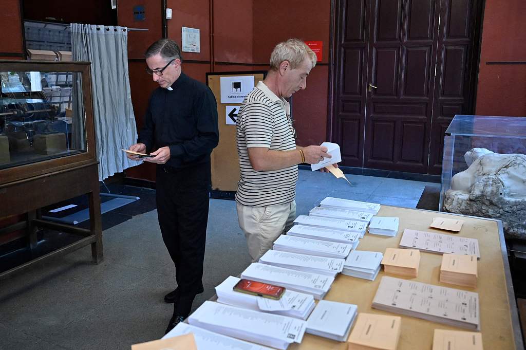 当地时间2023年7月23日,西班牙马德里,西班牙大选期间,一名牧师(左)在投票站准备选票。视觉中国 图