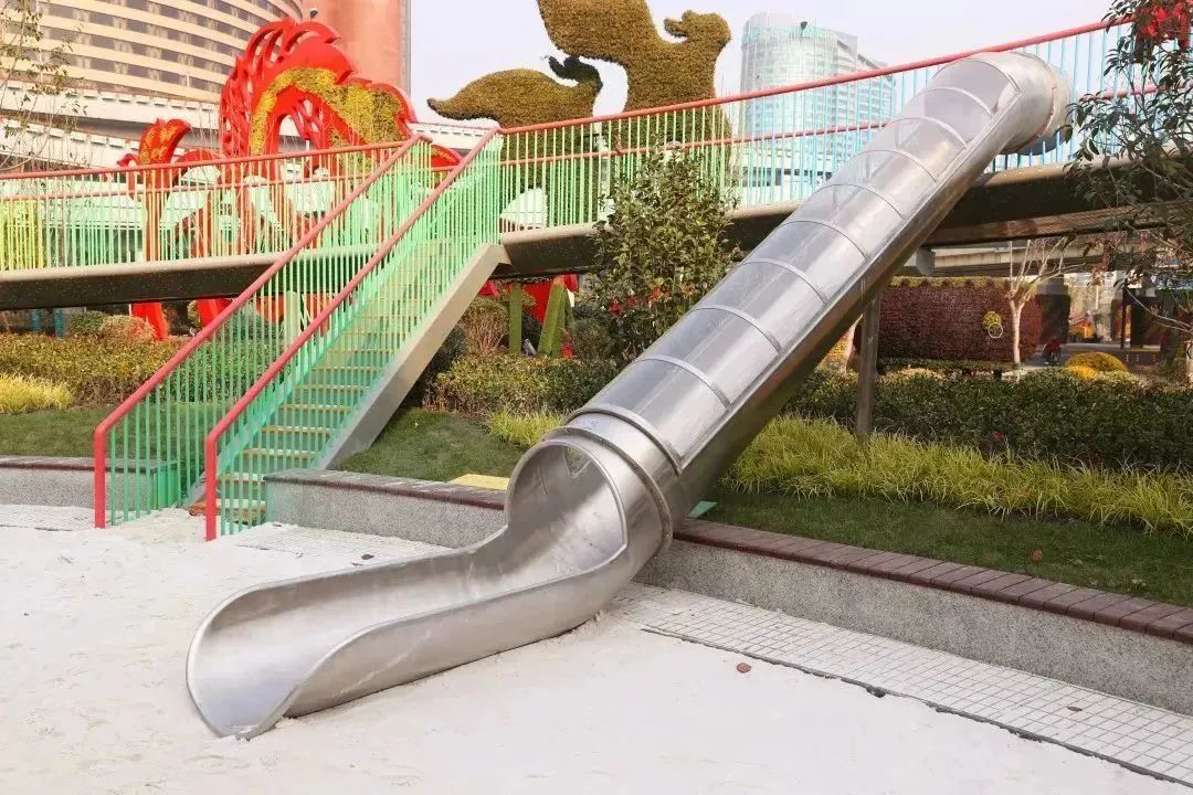 彩虹天桥、毛毛虫滑梯、立柱上“跳舞”的小白兔、小象洗手池、由集装箱改造的亲子驿站,这些设施听上去就很“酷”!公园里有片白沙滩,沙子细软,还配备了滑滑梯。