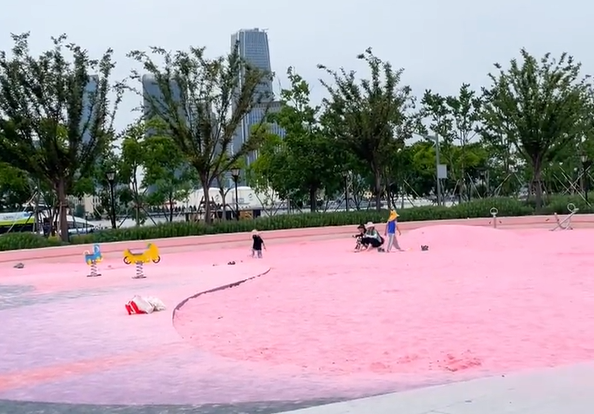 在公园13号门附近,新近开放了一个“多巴胺”沙滩,粉粉嫩嫩十分治愈,还有可爱的游乐设施。贴心的是,旁边就有冲水池。