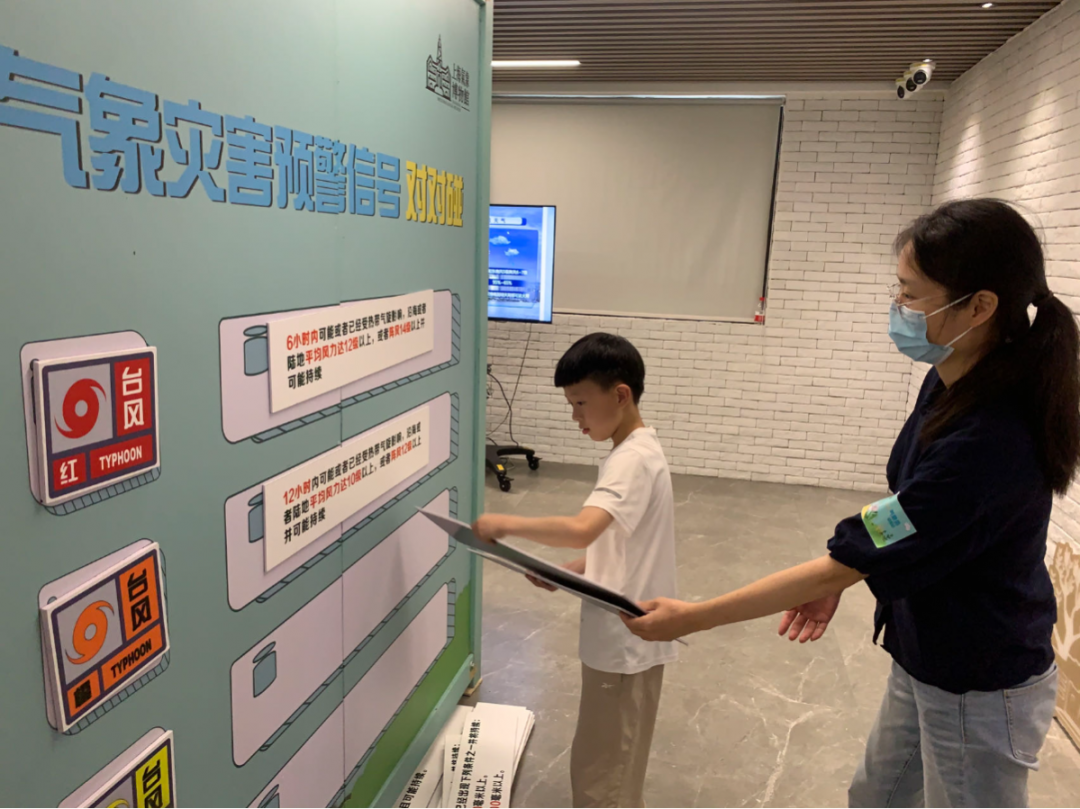 蓝色寒潮、黄色大雾、红色高温……想要成为“小小预报员”,就需要了解熟悉13种气象灾害预警信号的发生机制。小朋友们通过“预警信号对对碰”的游戏,将气象预警信号标识和相应发生机制进行配对,加深对气象的认识。