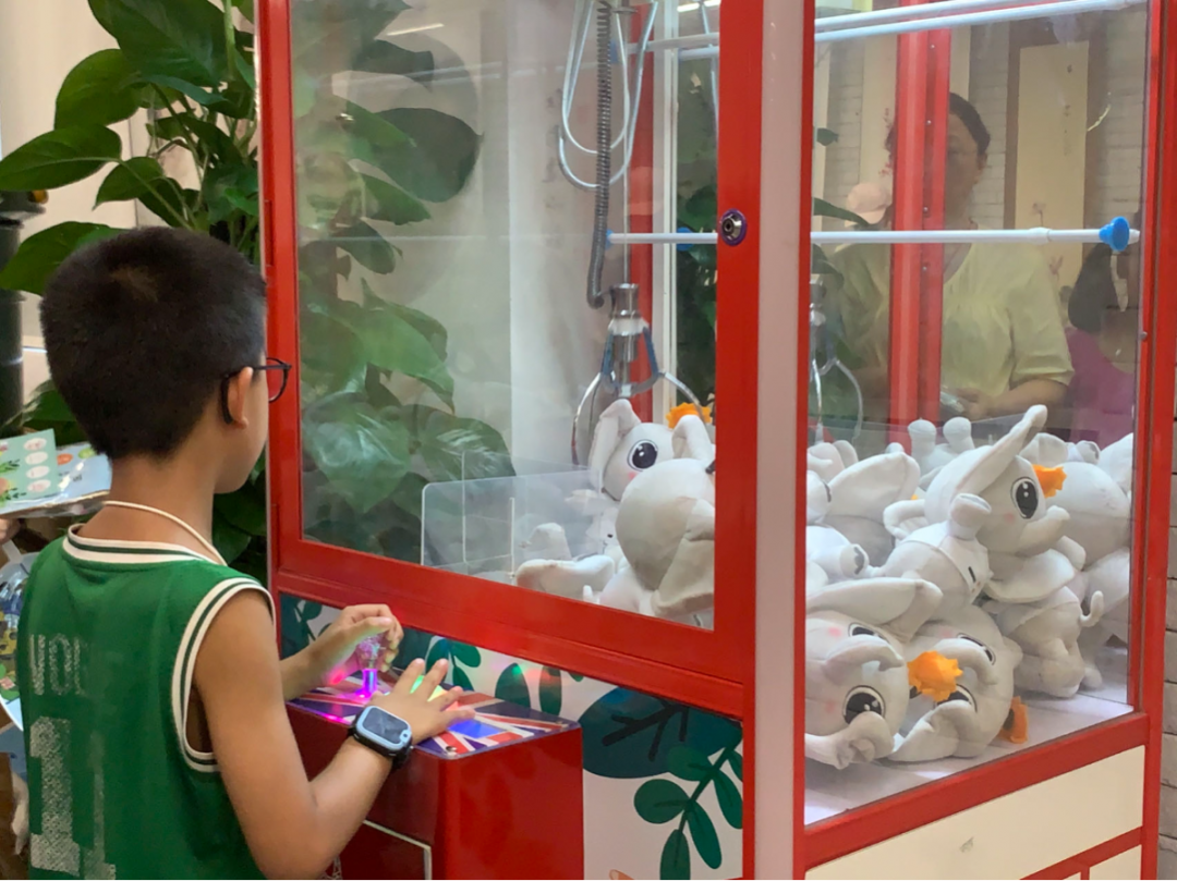 “气象小玩家”板块放置了抓娃娃机,这也是现场人气最高的活动环节。孩子们在这里排起长队,每人有两次机会抓取“气象本象”玩偶等文创周边。