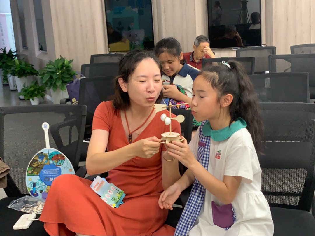 “小小观测员”板块则布置了相风铜乌、测雨器、寒暑亭等古代气象仪器相关介绍。孩子们在了解古代气象仪器的原理后,动手拼搭气象观测设备模型“风向标”。他们对着叶片用力吹气,模仿风刮过的场景,风向标也跟着转动起来了!叶片转得越快,说明风力越大,通过观察风向标的转动情况,孩子们直观地看到当天刮风的强度。
