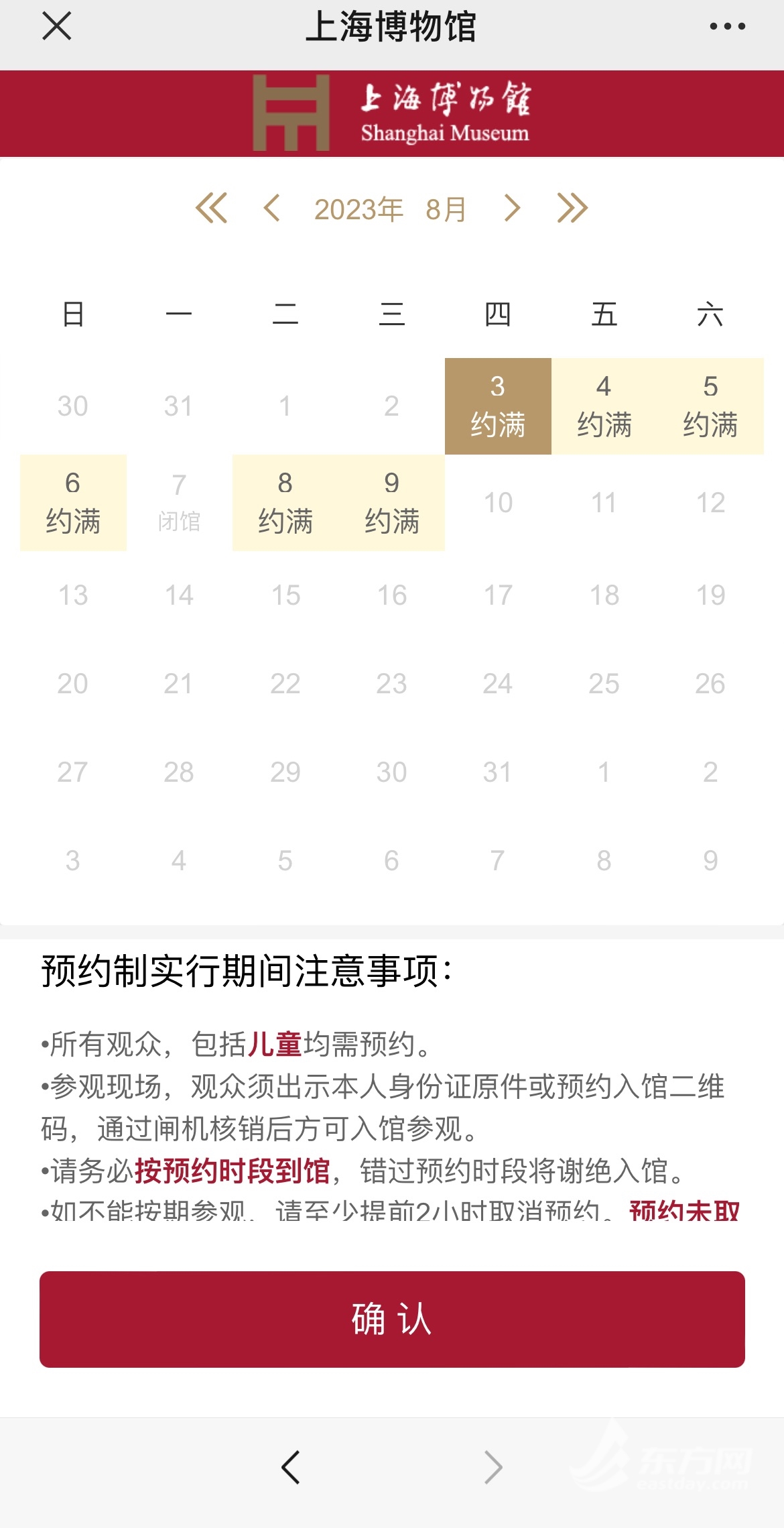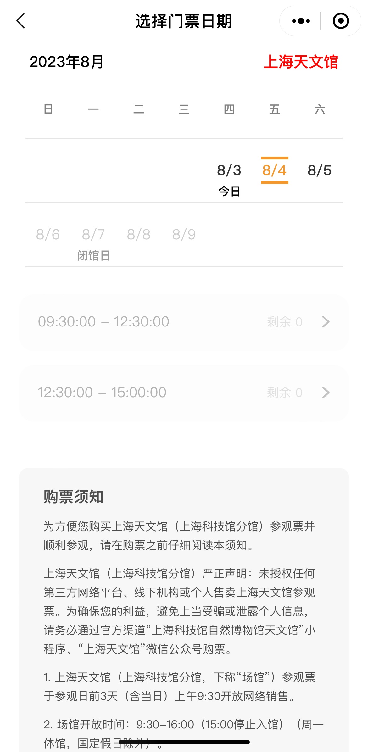 东方网记者查阅上海自然博物馆和上海天文馆的公众号,发现可选择的日期内所有时间段票均已售罄。记者从馆方获悉,目前上述两馆已是满负荷运转的状态。为了规范票务管理秩序、提供更多观众参观机会,8月1日至8月31日期间,官方推出两项票务限购措施:一是同一微信账号(注册手机号)限购参观票1单,每笔订单最多购买5张票;二是同一证件号(中国居民身份证、港澳台身份证件或外籍护照)限购1张参观票。