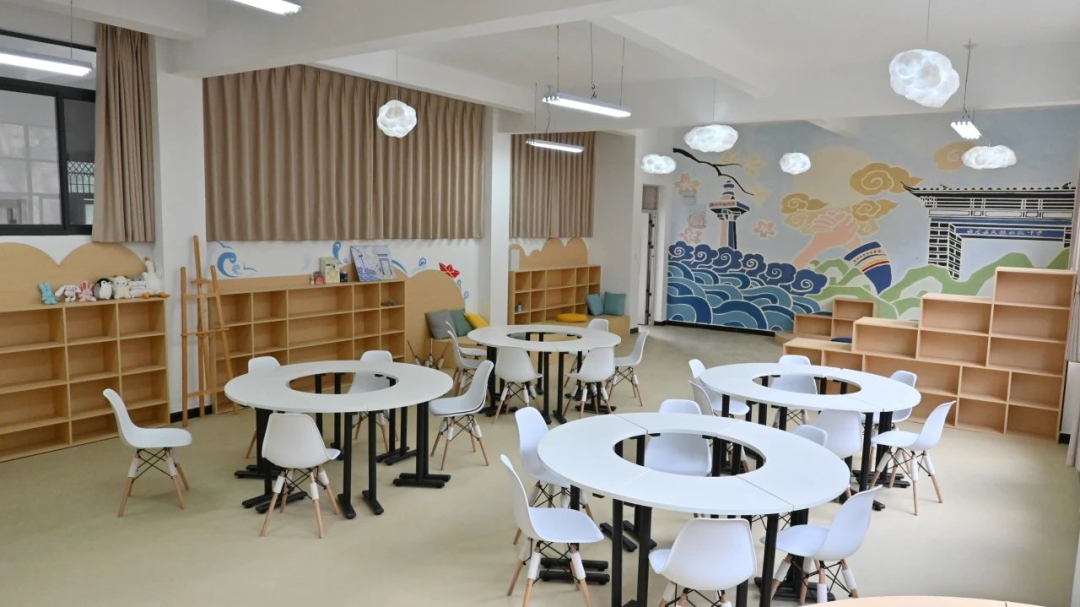 “云山韵”梦想教室位于云龙县民族初级中学同心楼,采用温暖的白色与浅木质颜色,根据需求划分为三个区域,包含图书角、解忧角、移动桌椅、智慧屏、墙绘,满足师生教学与读书的需求,充分展现了多元开放和青春筑梦的精神。