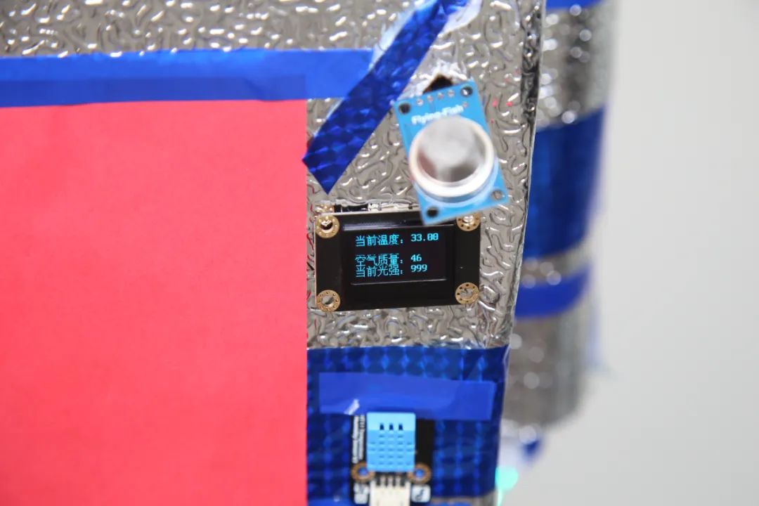 “我们利用各类手工材料和电子元器件,探索如何实现温度、湿度、空气质量、光强的监测与显示,以及异常情况下发出警报的功能。经过多次尝试,最终制作出功能性与智能化兼备的机能服。”李承泽说。