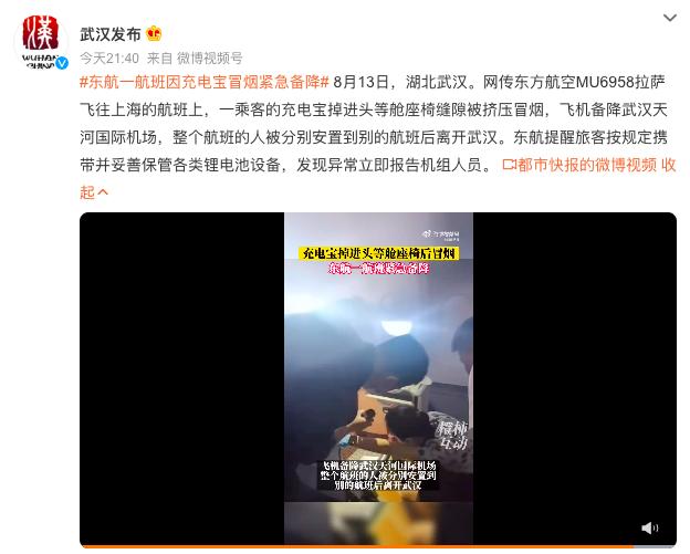8月13日,有网友发视频称,东方航空MU6958从拉萨飞往上海的航班上,一名乘客的充电宝掉进座椅缝隙被挤压冒烟,飞机紧急备降武汉天河国际机场。