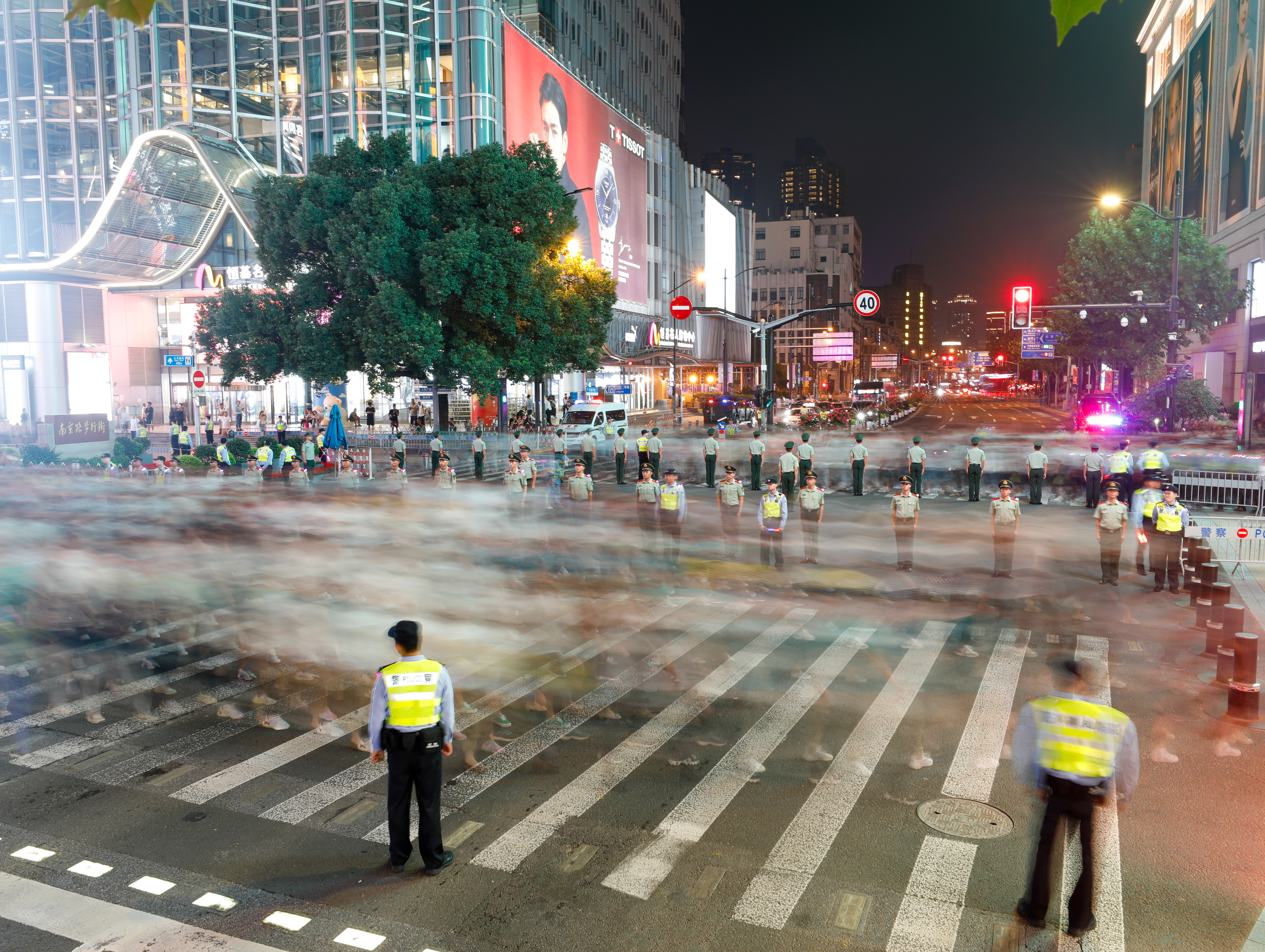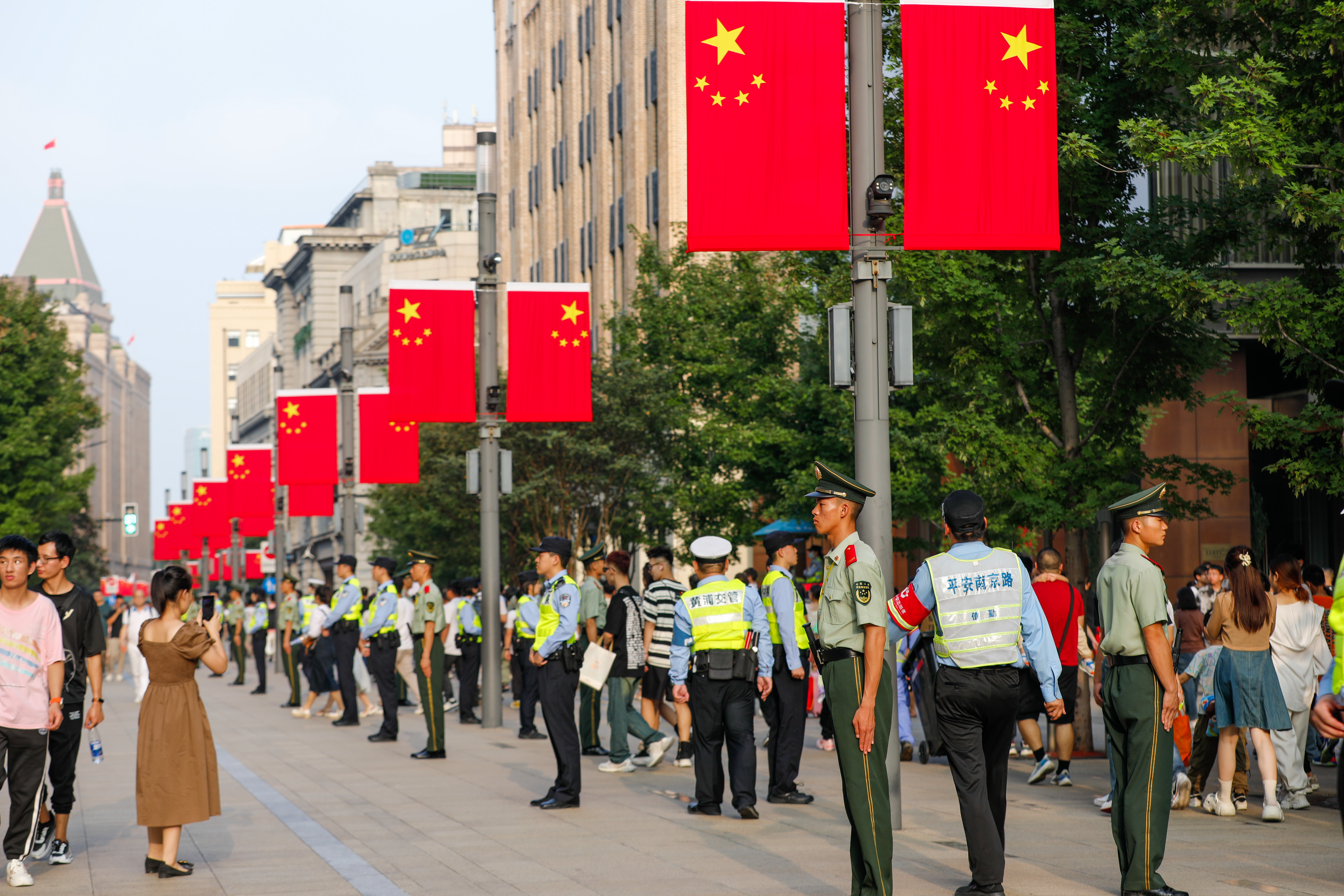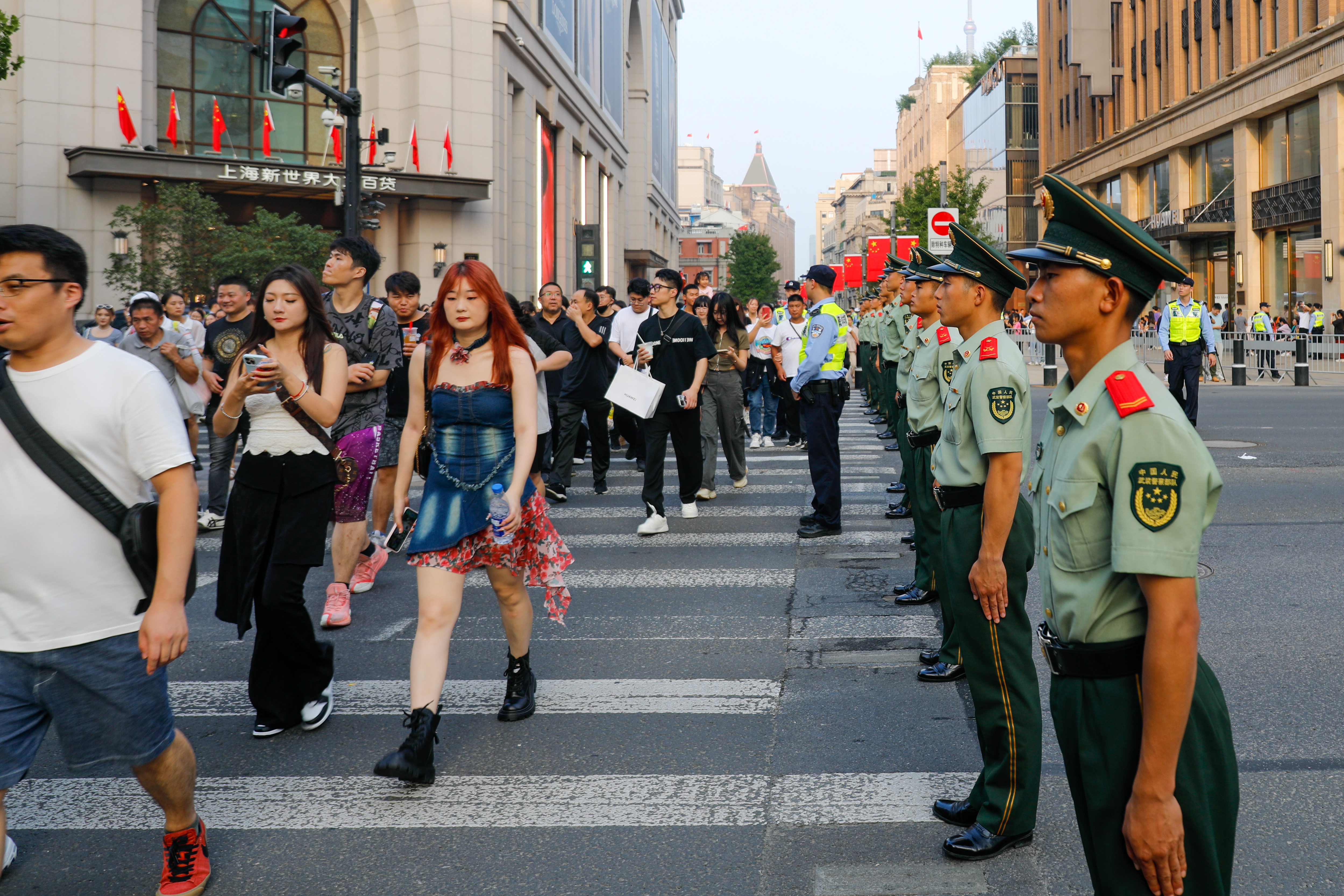 国庆假期南京路步行街迎来大客流,武警官兵在交叉路口组成“人墙”守护游客安全。