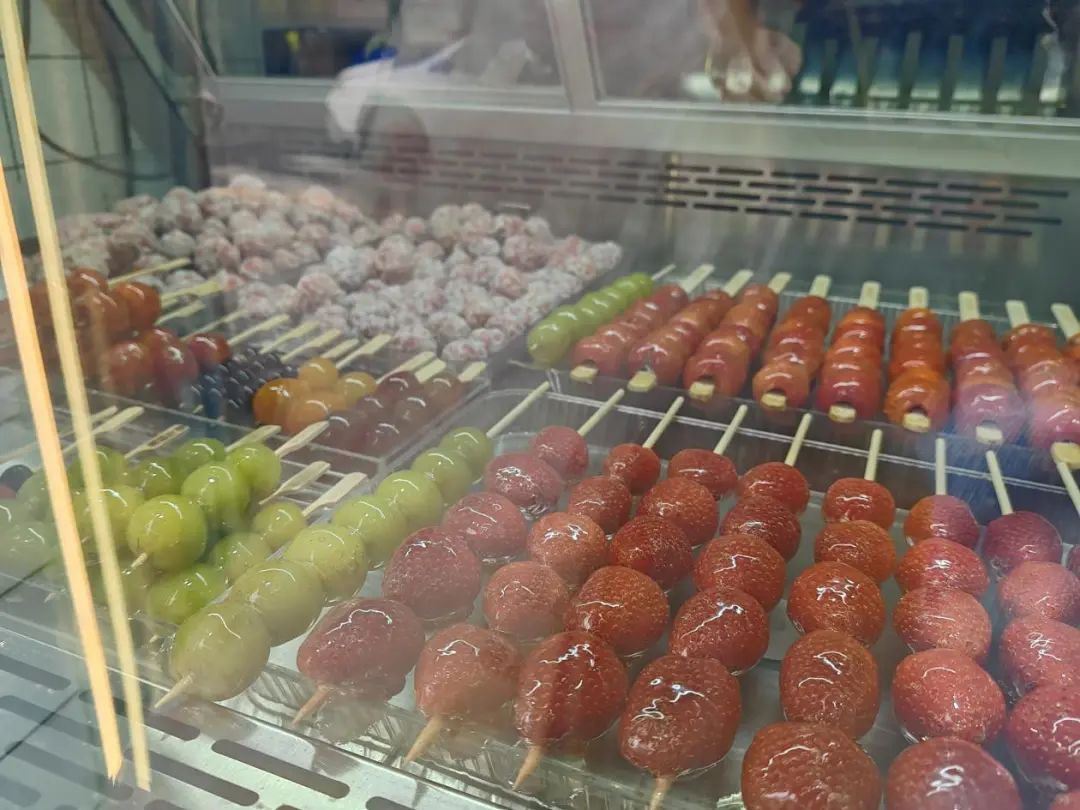 在玻璃柜台中,一串串的冰糖葫芦玲珑可爱、色泽鲜艳,具有十足的吸引力。晶莹剔透的水果被包裹在透明的糖浆中,散发独有的诱人光泽。一口一个小球,酸酸甜甜的口味交织在一起,充分满足味蕾。
