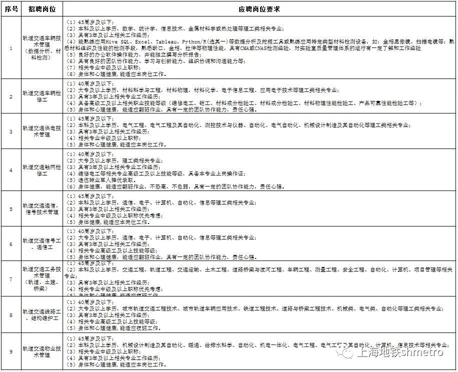 有意应聘以上岗位者可以关注微信公众号:上海地铁招聘,点击加入我们——社会招聘:查阅招聘岗位、年龄、学历、工作经历等具体要求,于2023年11月30日前投递简历。