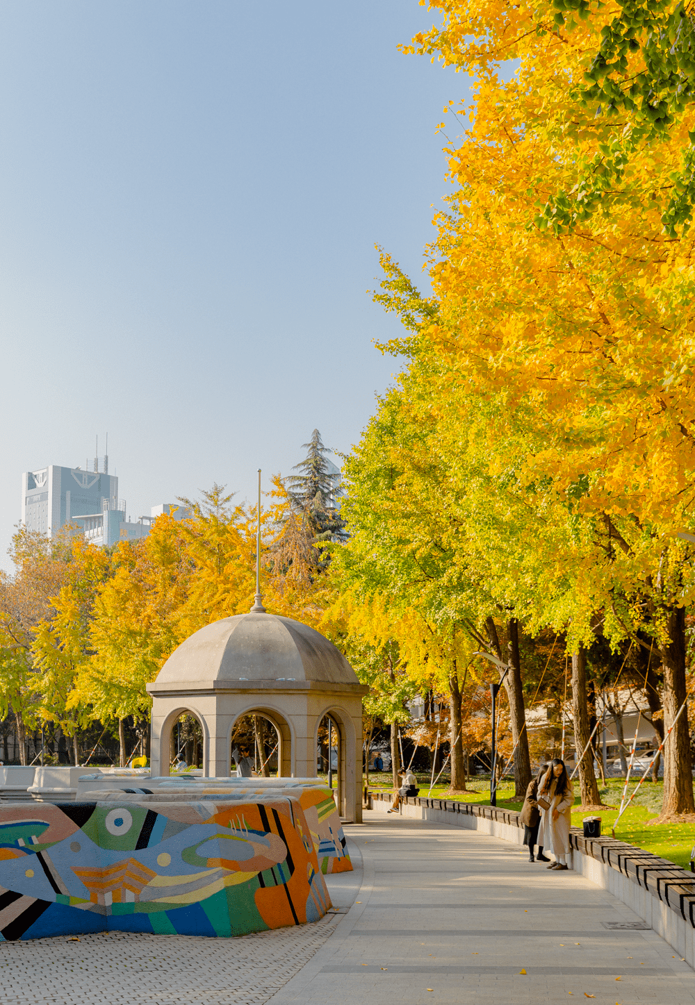 每到秋冬季,上海音乐厅广场总是让人期待。这里方正又规整的场地,每年都会铺上银杏地毯。一阵风掠过,金黄的银杏叶纷纷扬扬散落一地,漫步其上,沙沙作响。