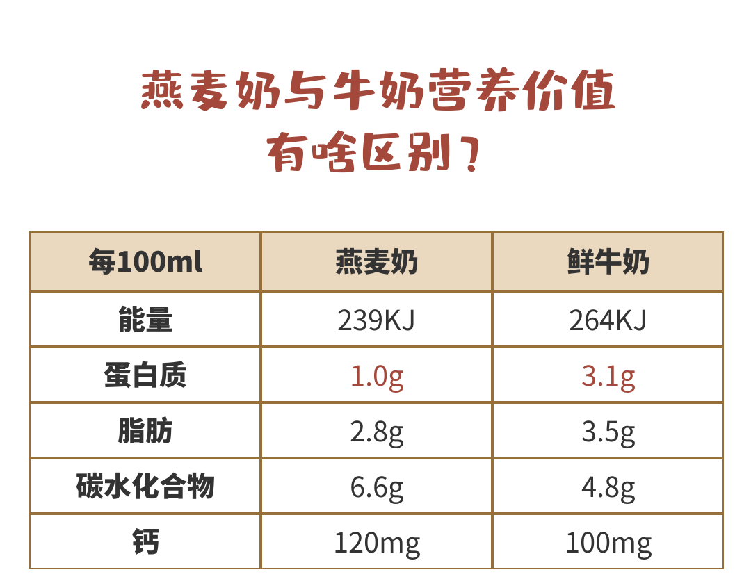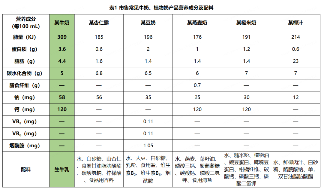 由上表可知,从营养成分数据来看,植物奶的蛋白质含量都低于牛奶,某些种类的植物奶完全不含有钙。因此,如果没有乳糖不耐受,那么牛奶还是获取蛋白质和钙的优质食物来源,不能用植物奶简单替代。