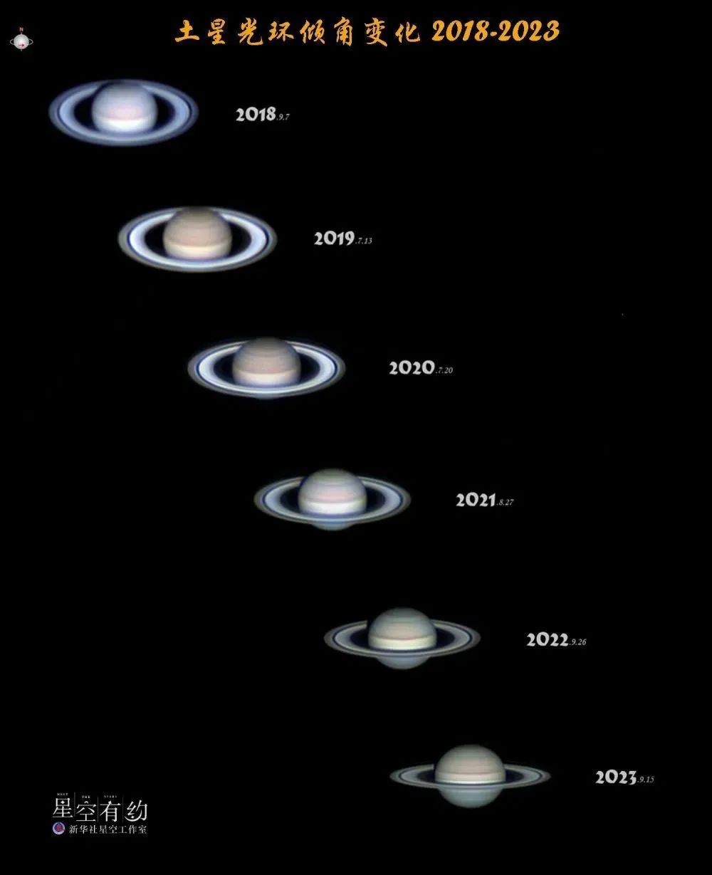 北京星空摄影爱好者王征连续6年在北京西城拍摄到的土星光环倾角变化(拼版照片)。