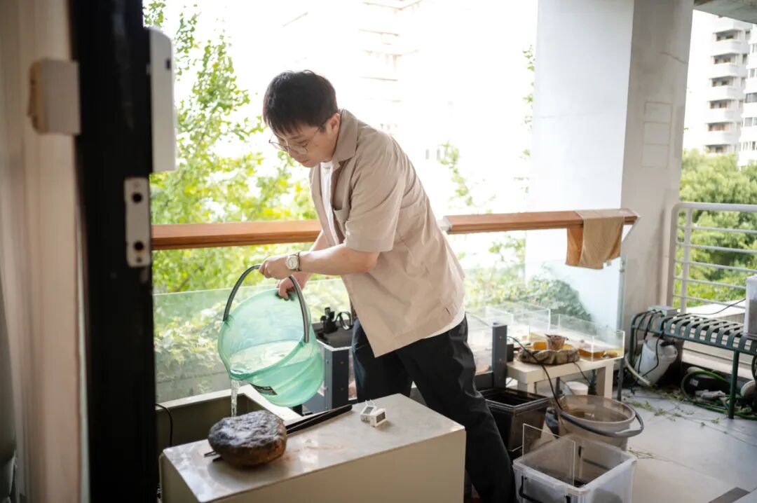 一边聊着养龟经,一边拿着水桶跑了几个来回,给阳台上砌的大池子加水,“这个水位还可以再高点。”接着他又垒了一块大石头,“给它一个高一点的岸。”
