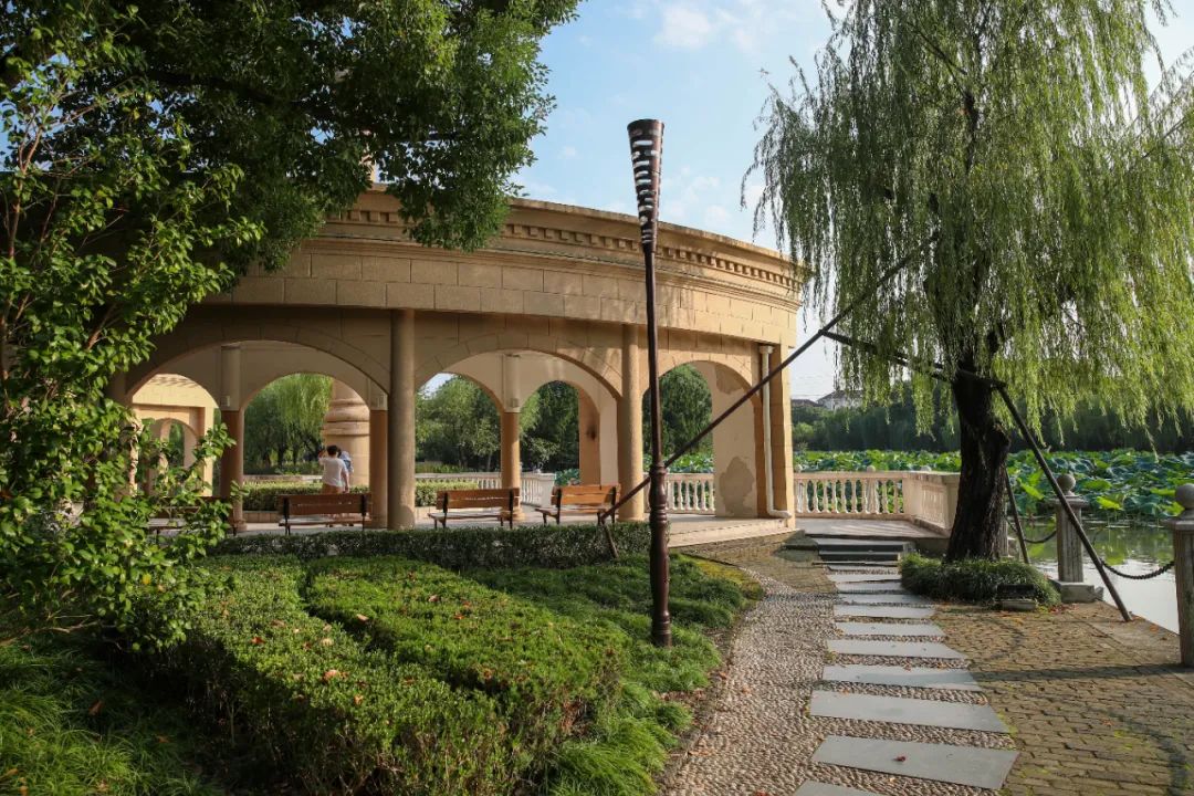 砖红色尖塔、罗马柱广场、环形长廊……在思贤公园,抬眼是浪漫的欧洲古典情调。公园以水为中心,围绕水面布景,漫步期间,便能畅享假日时光的静谧与悠闲。