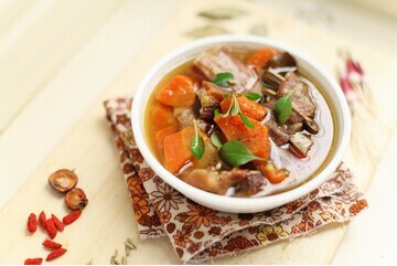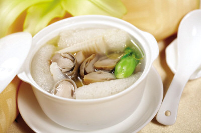 冬笋含有丰富的纤维素,能促进肠道蠕动,既有助于消化,又能预防便秘和结肠癌的发生。冬笋是一种高蛋白、低淀粉食品,对肥胖症、冠心病、高血压、糖尿病和动脉硬化等患者有一定的食疗作用。竹荪含有多种氨基酸、维生素、无机盐等,具有益气补脑、宁神健体的功效;竹荪还能够保护肝脏,减少腹壁脂肪的积存,有俗称“刮油”的作用,从而产生降血压、降血脂和减肥的效果。两者搭配煮汤,不仅味道鲜美,还能缓解“冬补”过后的积食状况。