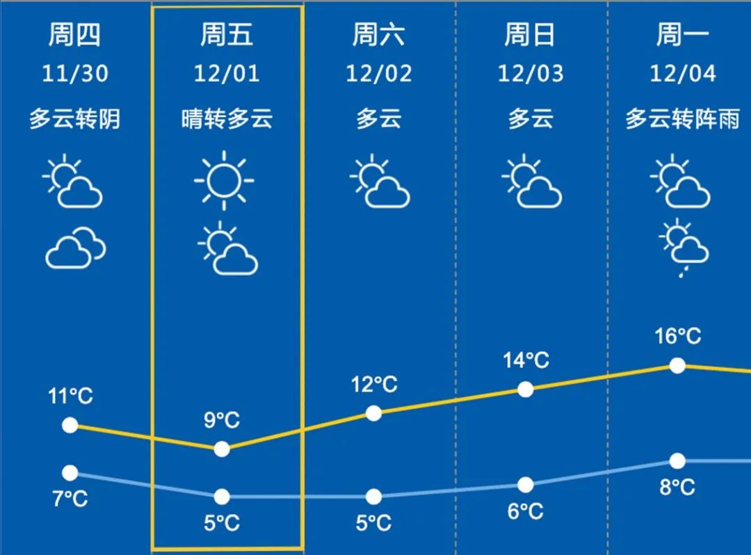 天气提醒:今天上海市区最高温度9°C,最低温度5℃。感冒指数:中等。